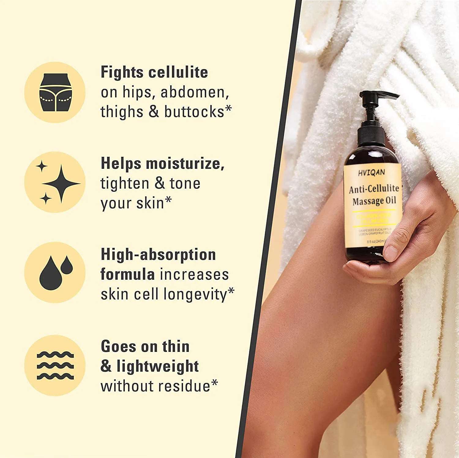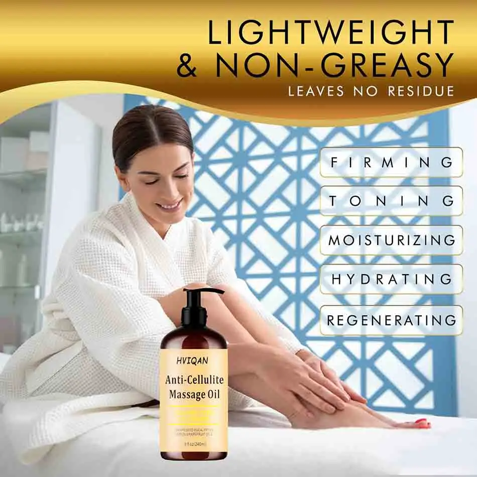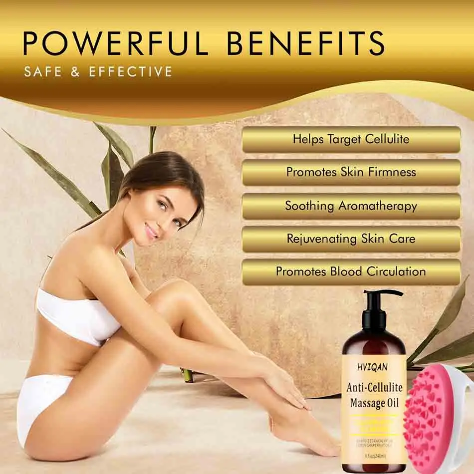 4.Massage Lotion. Cellulite Lotion Suitable for all skin types: The natural essential oils included in this blend are quickly absorbed and help give you strong tightening, moisturizing and regenerating benefits. Works great with our cellulite massager silicone brush. Cellulite has finally met its match.