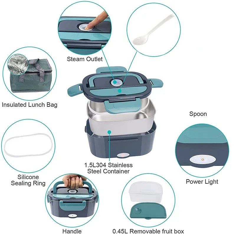 Take your lunch on the go with this versatile electric lunch box set! Perfect for picnics, school, or your daily commute, this 2 in 1 set includes a stainless-steel container that can be heated in the car, home, or with multiple voltage options. Stay fueled for your next adventure!