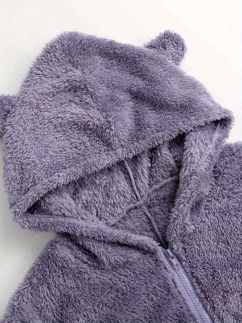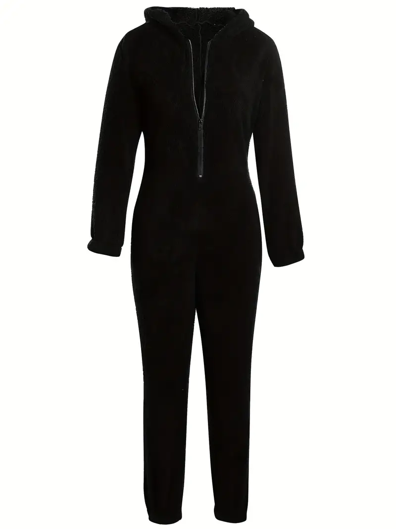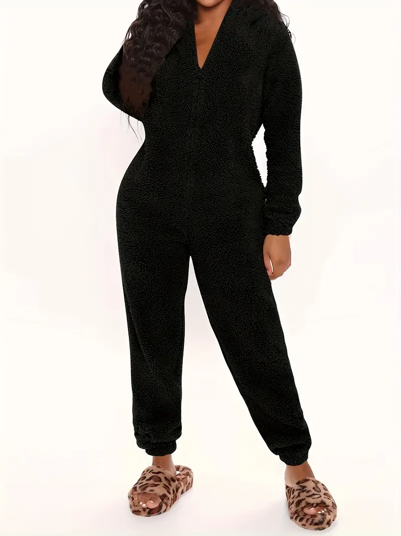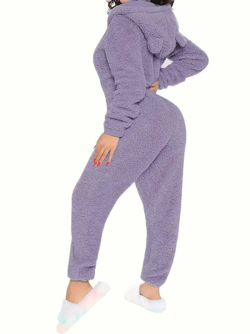 Fuzzy Hooded Pajama Jumpsuit For Music Festival, Comfy & Cute Long Sleeve Zipper Pajamas, Women's Lingerie & Sleepwear