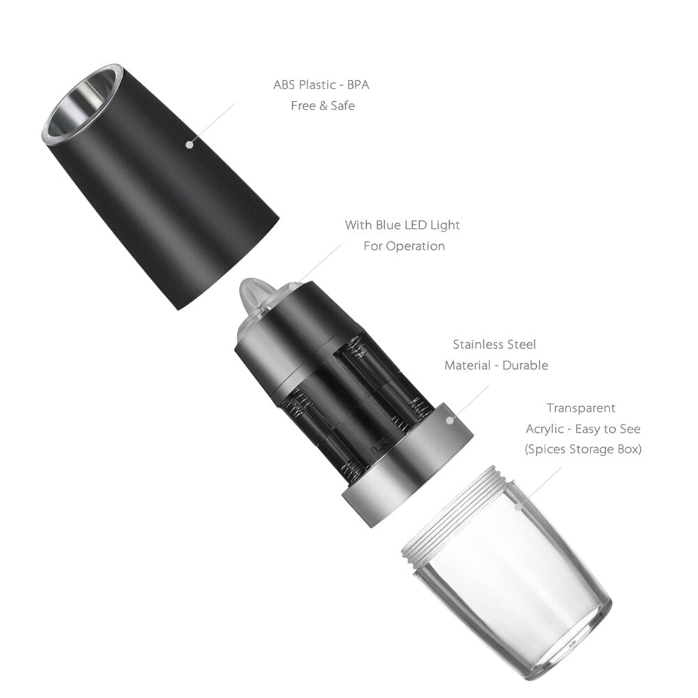 Blue LED Light: Not cheap-looking and boring white light anymore, blue light is not only bright but also gentle. When you have dinner with your family or loved ones, this gentle blue light adds a warm and romantic atmosphere. The blue LED light will turn on automatically during use, you can see exactly where your seasoning is landing.