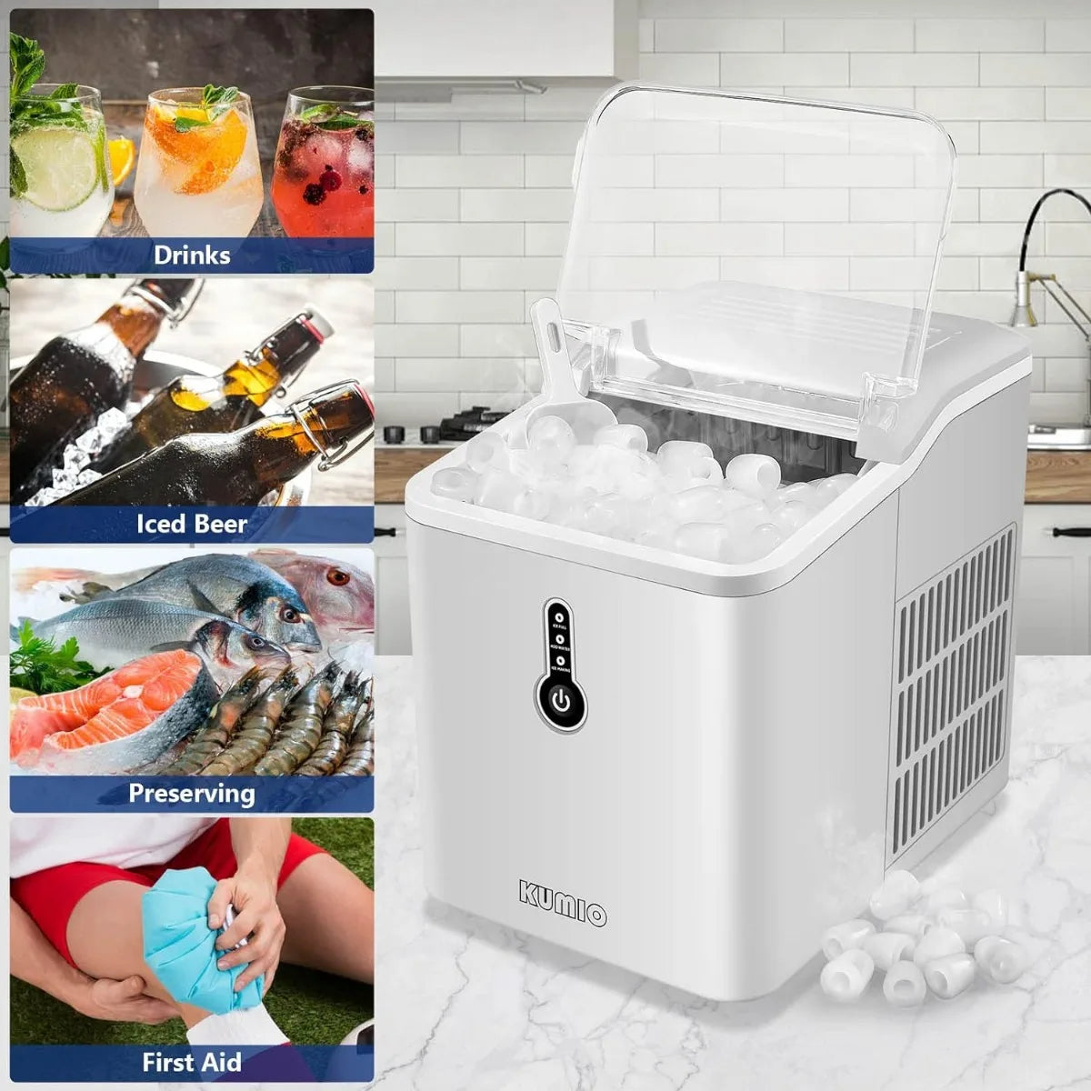 【Portable & Compact Ice Maker】KUMIO ice maker countertop measures 8.98 x 12.6 x 11.69 inches and weighs only 16.98 pounds, making it easy to carry and suitable for kitchen, party, office, RV, camping, bar, etc. The durable ABS case is smooth and easy to clean. The bottom has a spout, and drains plug for easy dumping of unused water.