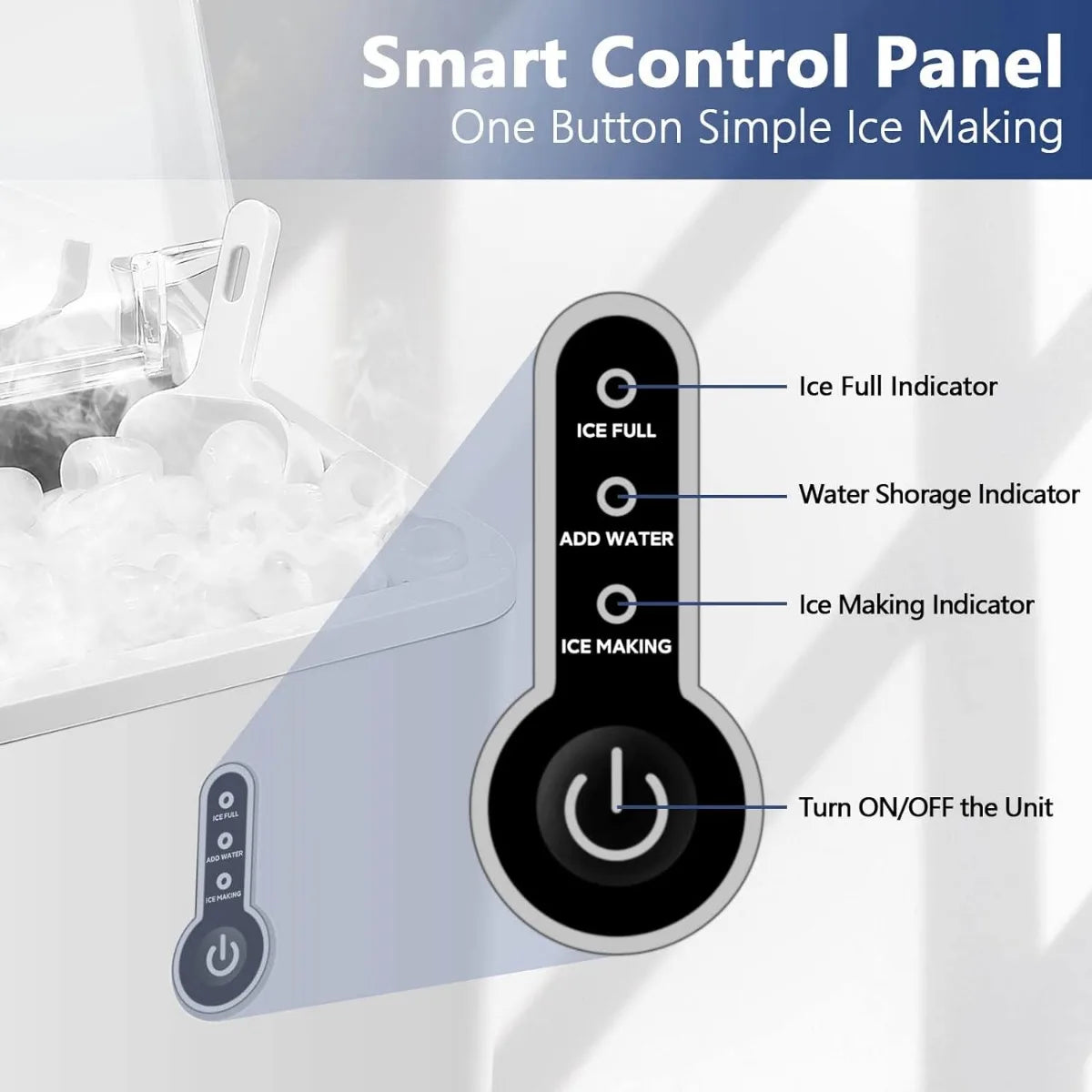 【User-friendly Equipped with a one-touch control panel. The large transparent lid allows you to monitor the ice-making process. The built-in infrared sensor automatically detects if the ice is full and stops production to prevent overflow. An indicator light comes on when the water is low, or the ice basket is full. It also comes with a removable ice basket and ice scoop for easy transfer of ice to your beverage or ice bucket.