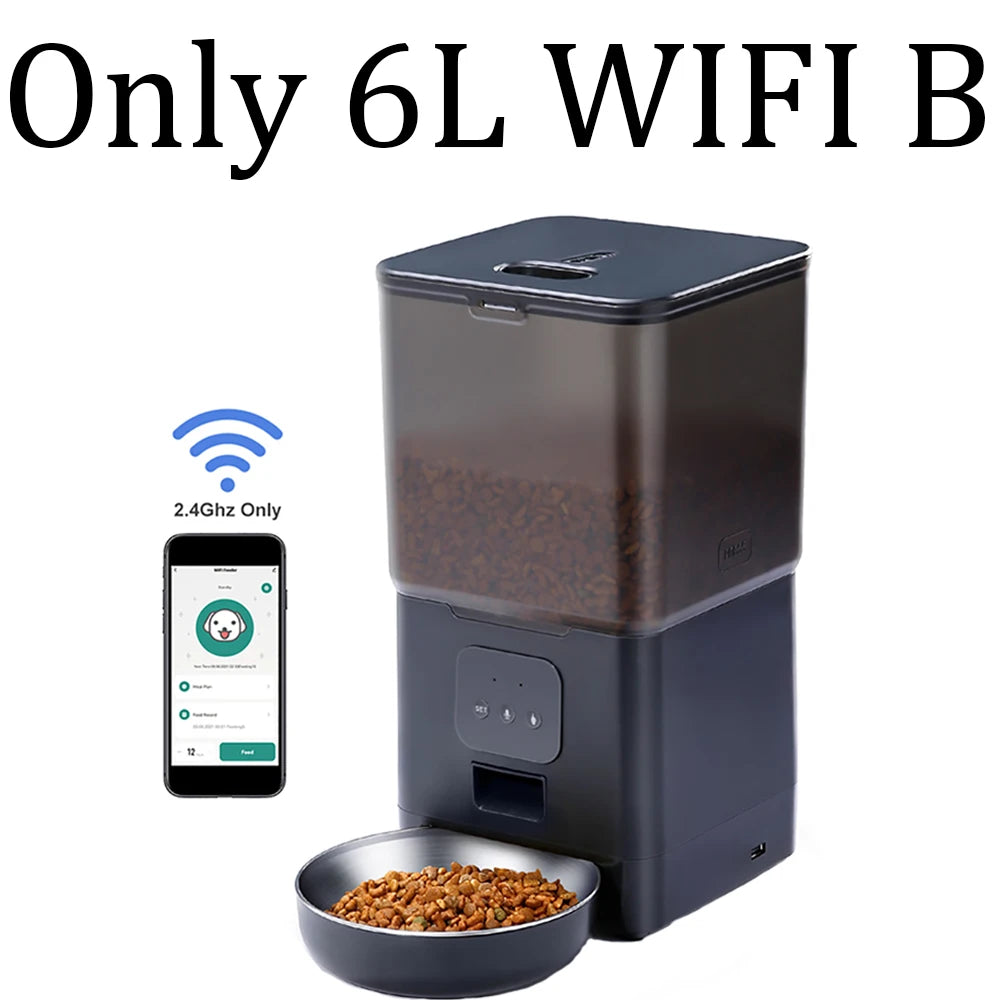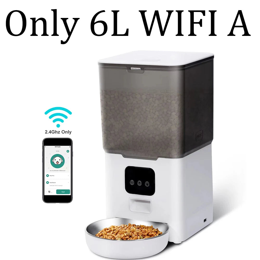 APP Feeding: Great food dispenser with remote APP control, feed your pets from anywhere anytime with your phone (Android and iOS) and track feeding records for management control. Remotely set times and amount of food to feed your pet automatically and can be shared to multiple accounts, easy to set up. Support 2.4GHz network only