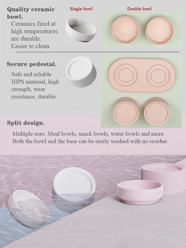 Features: Ceramic, HIPS non-toxic and tasteless, environmental protection and safety, non-slip and anti-knock, ceramic bowl can be removed for cleaning, high feet to prevent pet wet mouth, anti-black chin, good water, large capacity.