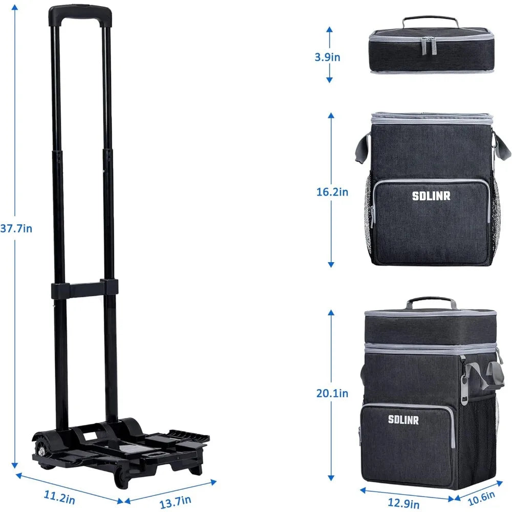 - STURDY TO ROLL - SDLINR rolling soft cooler features a detachable cart with extra wide base, all terrain wheels and long telescoping handle, which can extend to 37.7" H and lock into 3 positions, easy pull for both men and women. By attaching the bag backside and bottom to the cart, either empty or full, this wheeled cooler will stand upright and very sturdy.