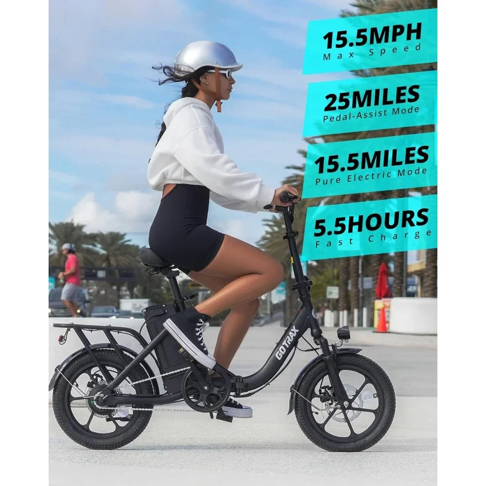| Special Feature | 25 Miles Max Range (Pedal-assist1), With Rear Cargo Rack, Powerful Removable Battery, Adjustable Handlebars, Foldable Design, 5.5 Hours Fast Charge, 350W Brushless Motor, Dual Disc Brake, Adjustable Comfort Seat, 2 Charging Options, Front Shock Absorbing Fork, 3 Cycling Modes, Recommend Height 155-190cm, Suitable for Commuter/Leisure, 15.5Mph Max Speed |