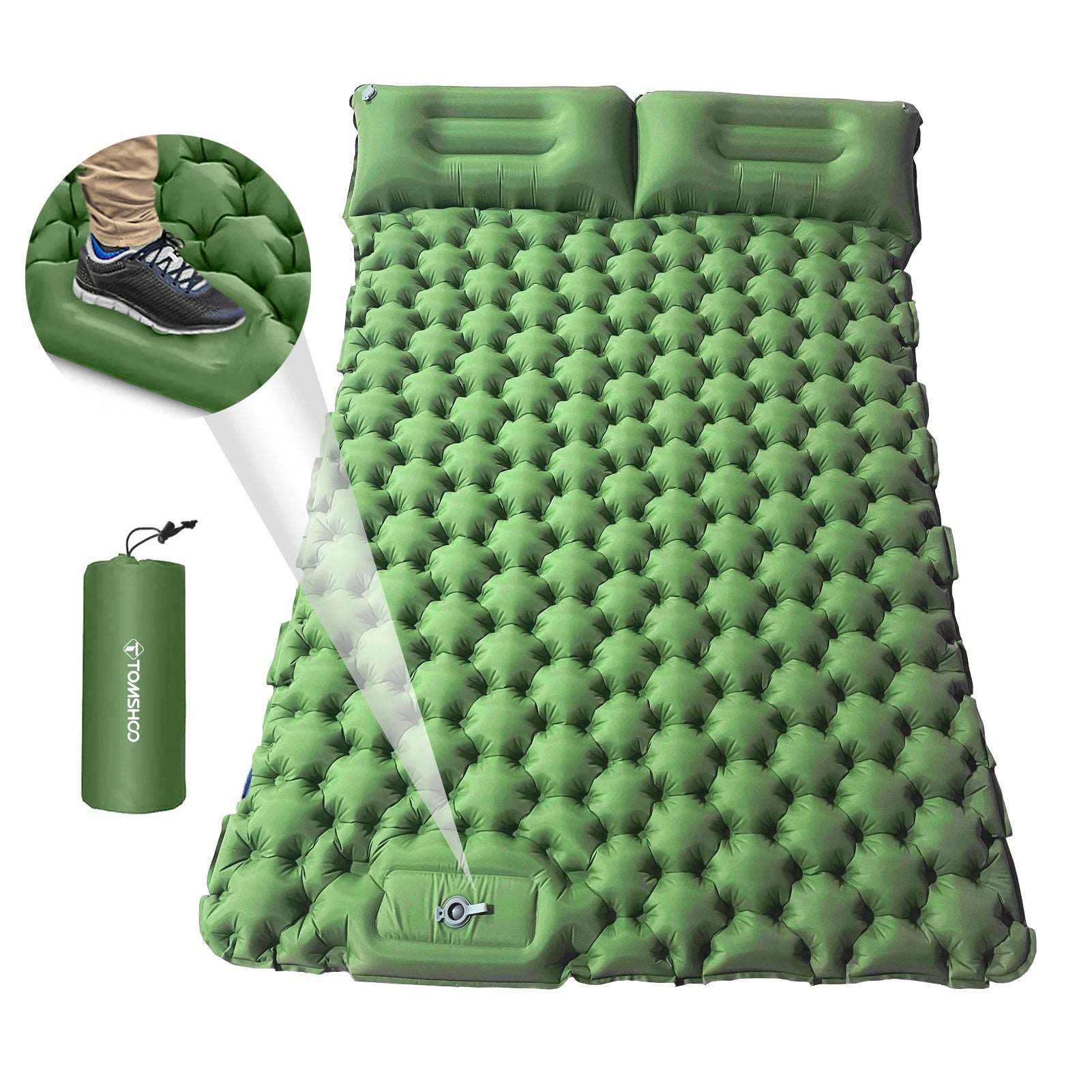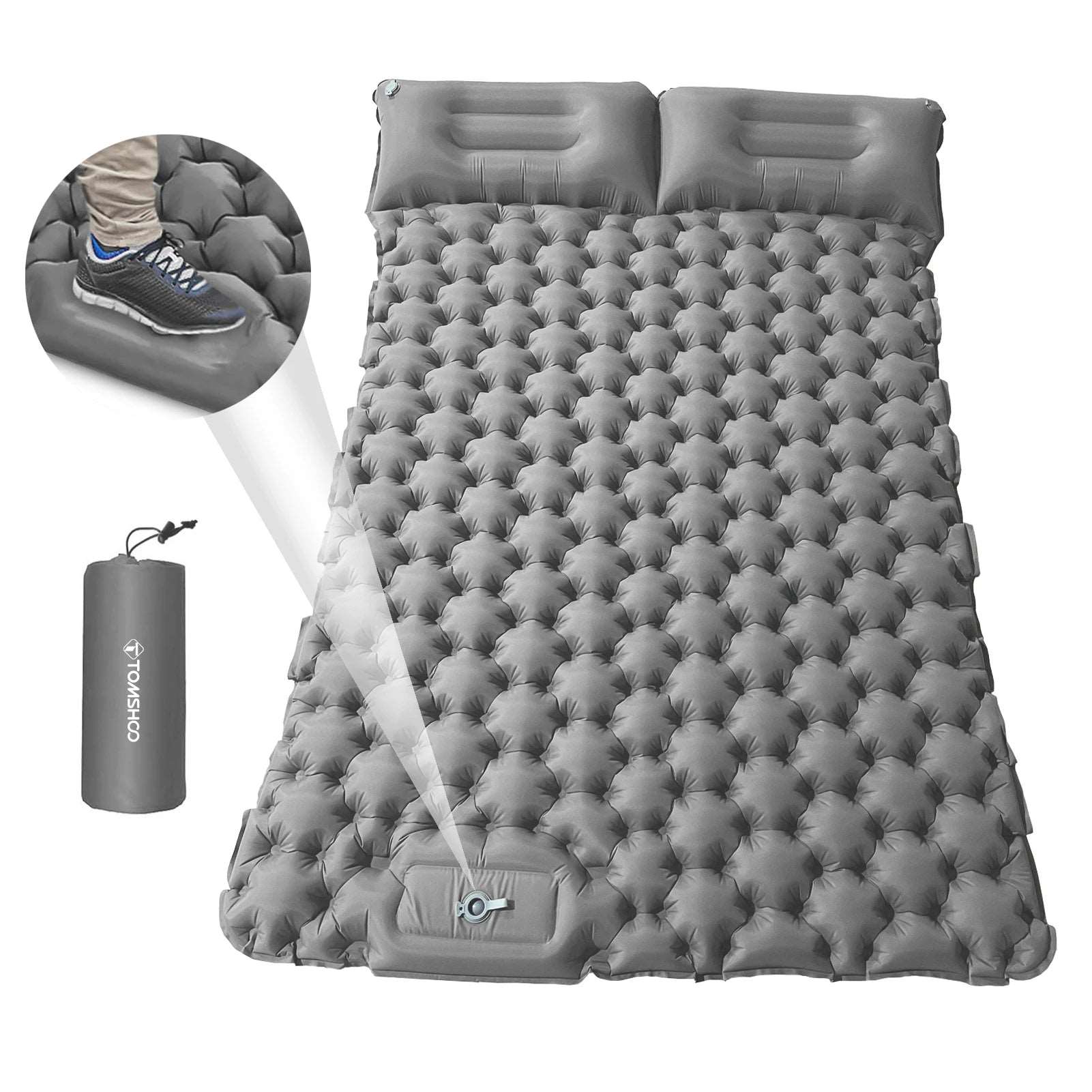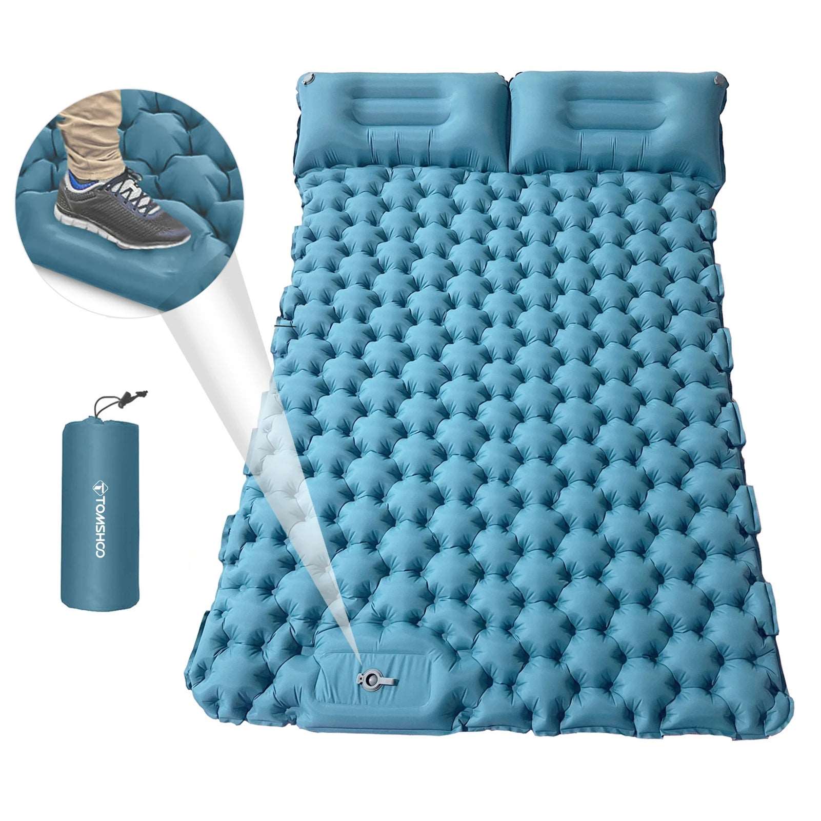 No pump needed. Quick to inflate the air mattress by foot/hands. And open the deflation valves of the pillows to deflate quickly.